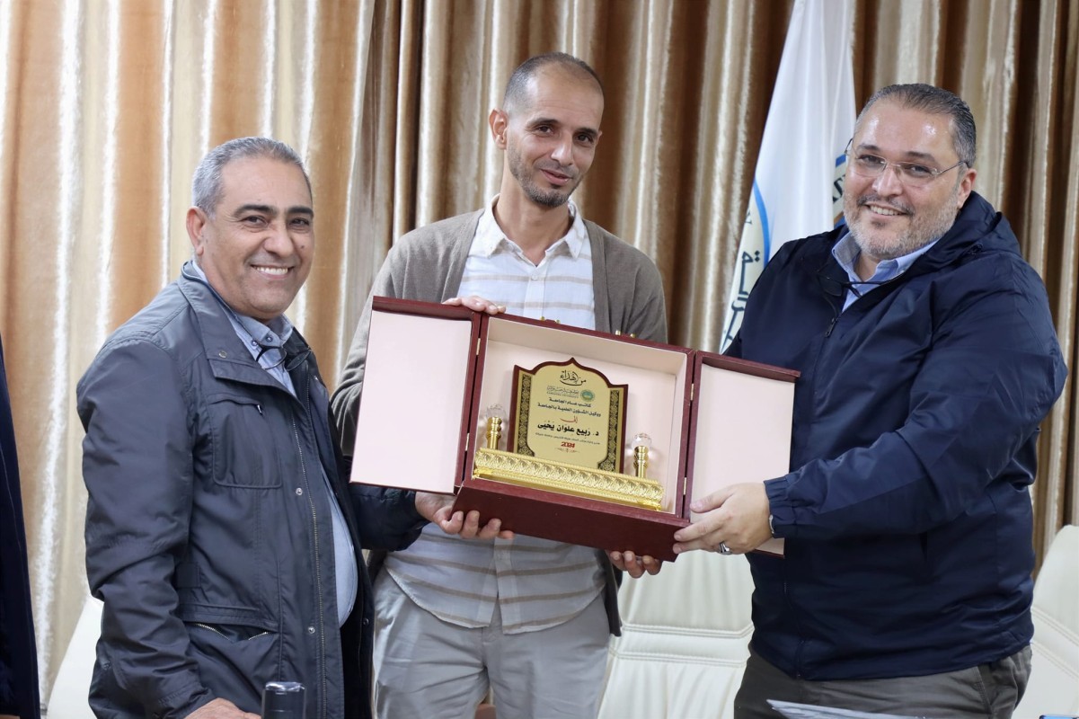At the end of the meeting, Dr. Rabi Alwan Yahya was honored by the university's secretary general and the deputy for academic affairs for his efforts in organizing the workflow in the Faculty Affairs Management and addressing several stalled files related to the faculty members at the University of Sabratha, as well as for his role in the Faculty Affairs Committee as a member and rapporteur.