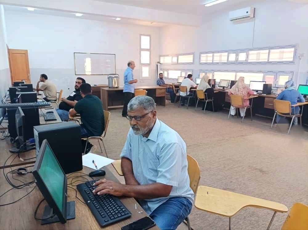 As part of the university's role in serving the community and its openness and cooperation with various institutions, a training course in computer skills development and applications is ongoing in the training hall at the Faculty of Engineering in Riqdalin. This course includes several employees working in the municipal councils of the western region (Al-Jumayl, Al-Manshiyah, Riqdalin, Zliten).